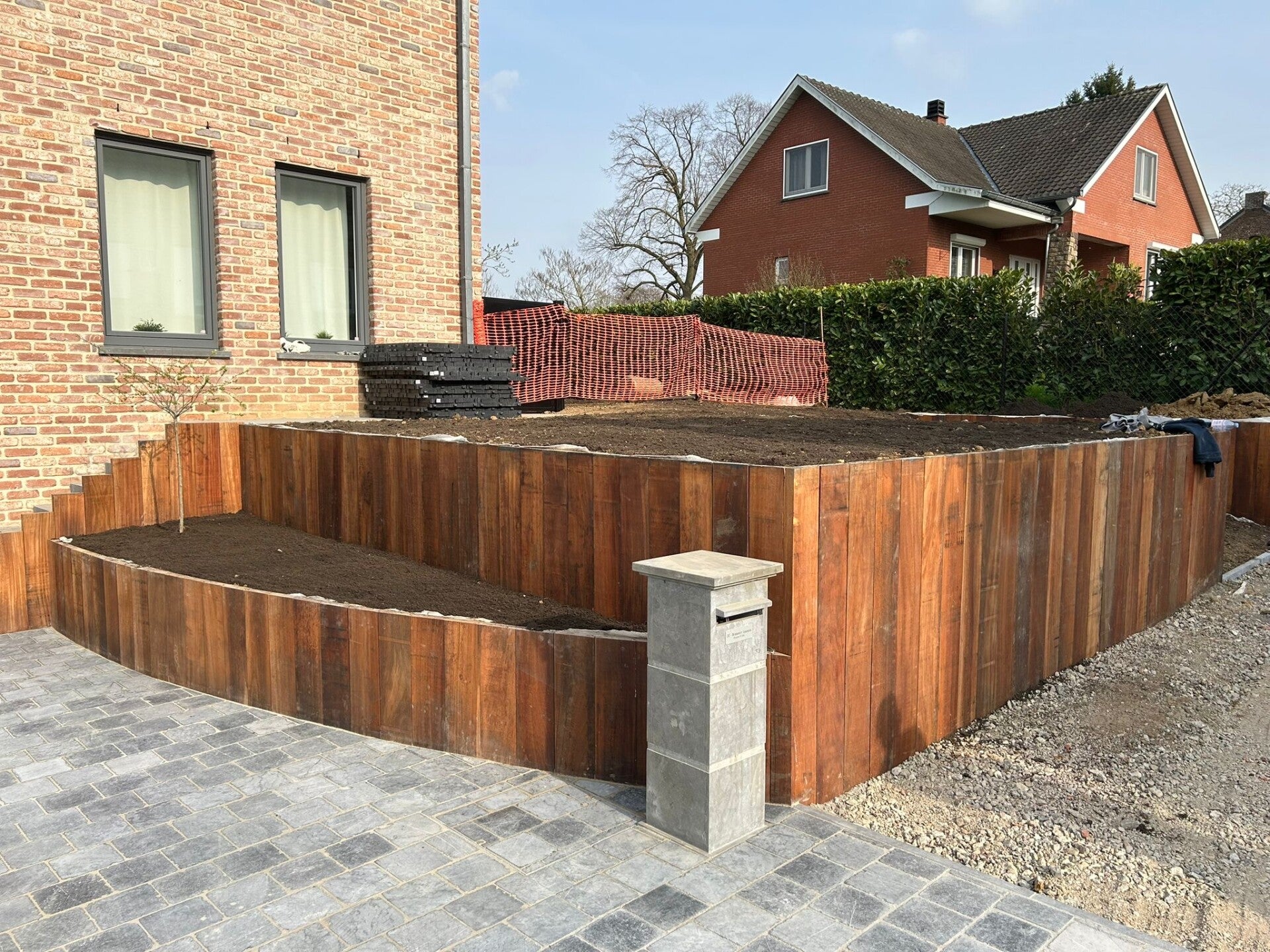 Chantier à Glimes : Aménagement d'une terrasse en pierres bleues vietnamiennes et mur de soutènement en azobe