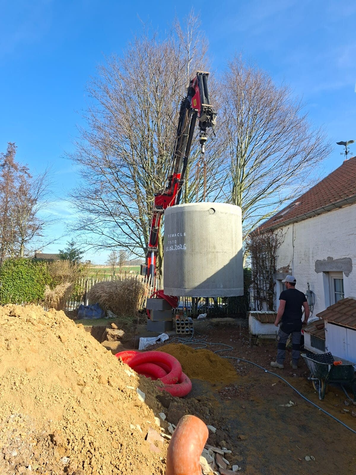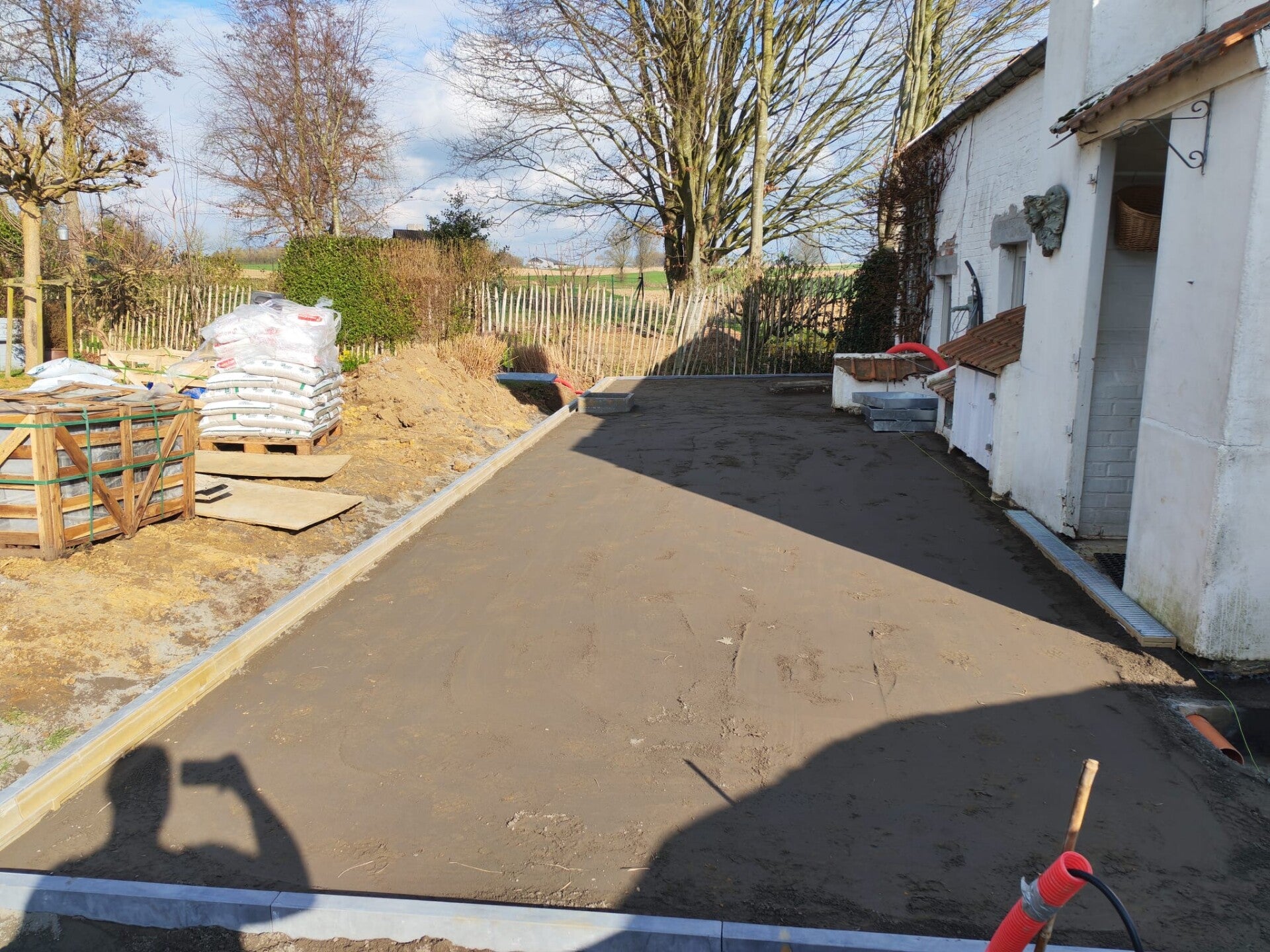 Chantier à Hannut : Construction d'une piscine 9/4 avec lame d'eau, nouvel égouttage avec installation d'une nouvelle citerne, terrasse et allée de garage