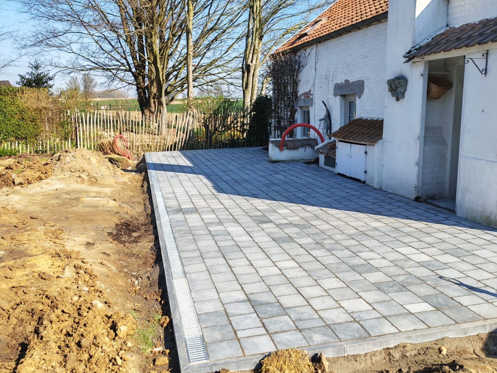 Chantier à Grez-Doiceau : Aménagement d'une terrasse en carrelages, escaliers, bordures et pose de caniveaux