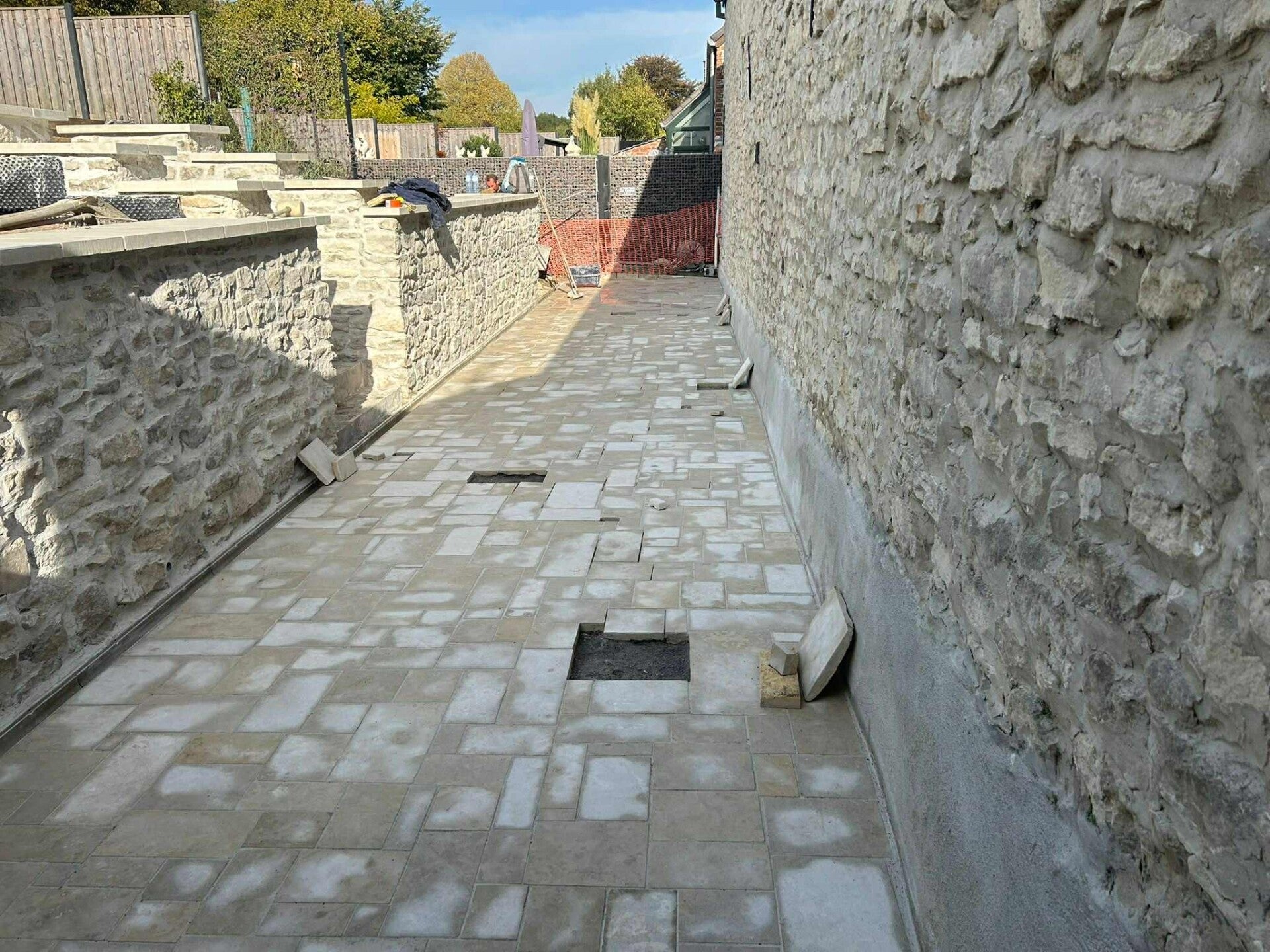 Chantier à Chaumont-Gistoux : aménagement d'une terrasse en pavés Marlux Stonehedge Roubaix, joints au sable blanc.