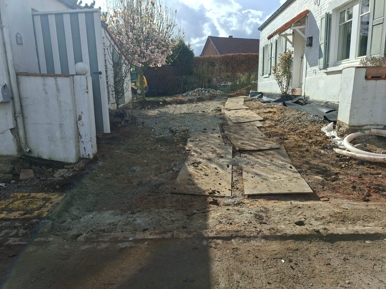 Chantier à Perwez : Rénovation d'une allée de garage, création de terrasses et allées, installation de palissades et d'un portail automatique et plantations